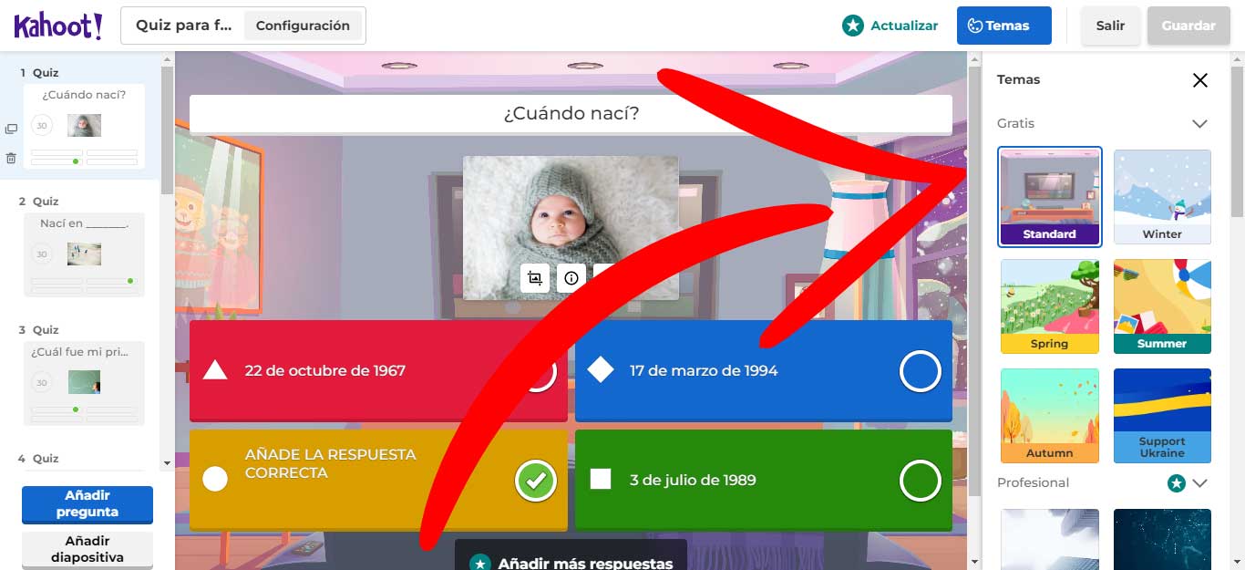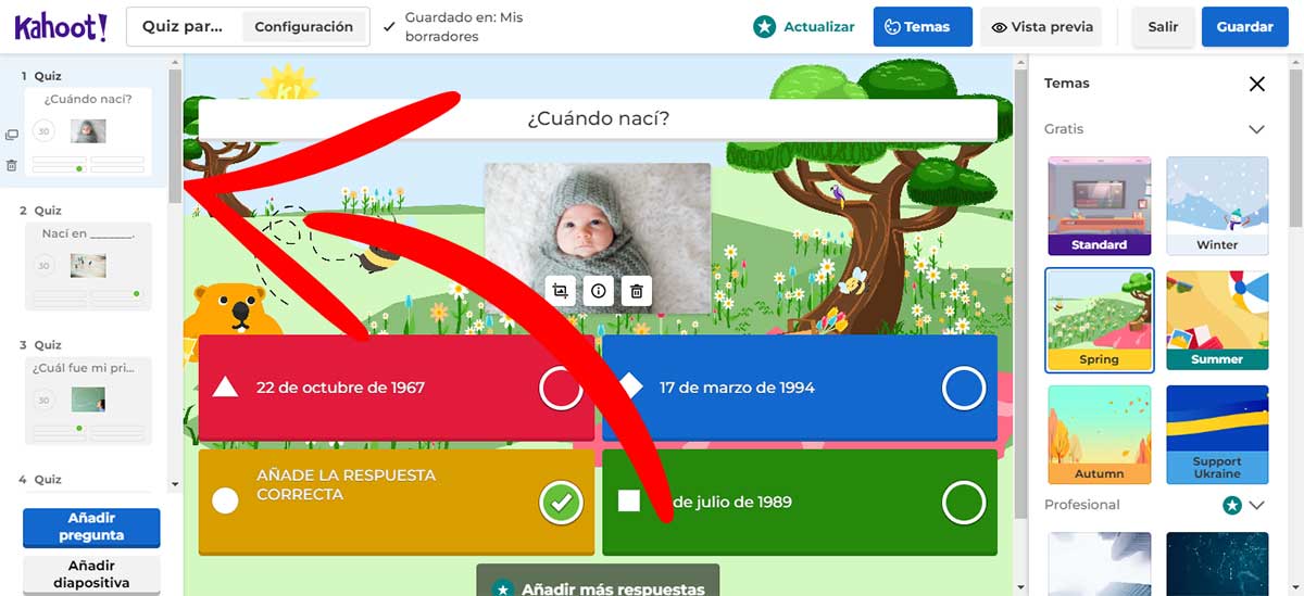 A partir de este momento, puedes empezar a personalizar todos y cada uno de los detalles del concurso. Desde el fondo de la presentación del cuestionario a través del menú que se encuentra en la parte izquierda, hasta definir cada una de las preguntas. En la parte izquierda, en el menú, puedes personalizar cada una de las diapositivas, añadir o quitar páginas y darle el toque personal que prefieras al concurso.