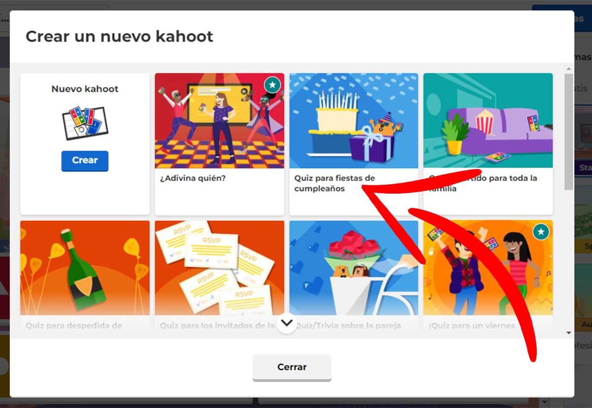 En la siguiente pantalla aparece una gran variedad de opciones disponibles para crear un Kahoot entre las que es posible elegir. Desde Adivina quién, un cuestionario divertido para toda la familia, para fiestas de cumpleaños, para un viernes divertido, para hacer una lluvia de ideas con amigos, aprender un idioma y hasta para romper el hielo.