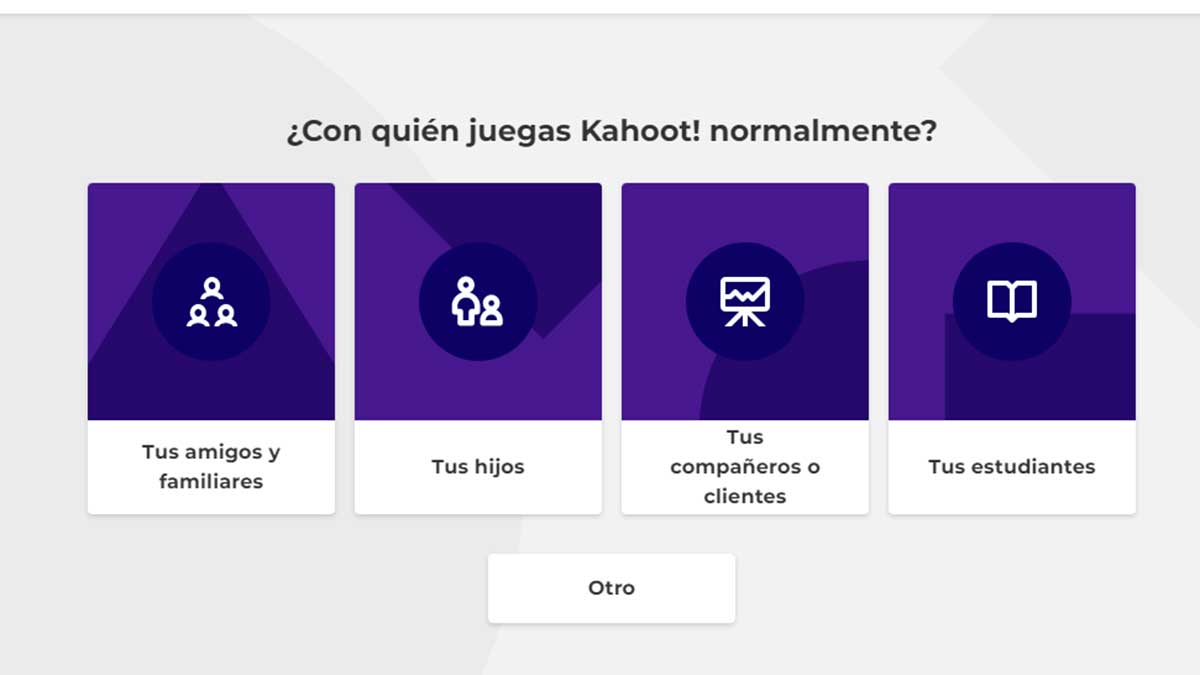 Una vez elegida la cuenta que quieres crear, en este caso hemos seleccionado uso personal, se abre una nueva pantalla que pregunta con quién juegas a Kahoot normalmente. Si con compañeros, amigos, tus hijos o amigos y familiares.