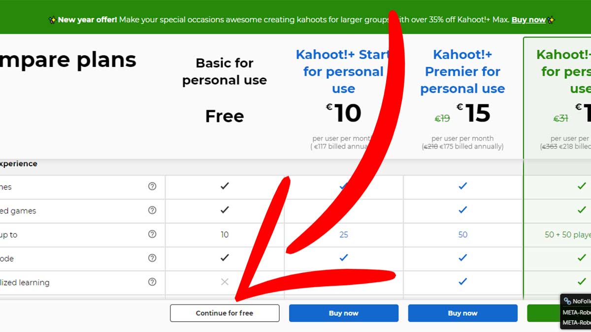 Una vez completado el registro se abre una pantalla con todos los planes de pago y gratuitos de la plataforma. En este caso, continuamos con el plan gratuito de Kahoot para diseñar un cuestionario.