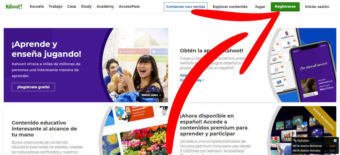 Desde la pantalla principal de la web de Kahoot hay un botón de acceso directo al registro. Se encuentra localizado en la parte superior derecha, tal y como puedes ver en la siguiente imagen, y está enmarcado en un cuadrado verde que dice ‘Regístrate‘.