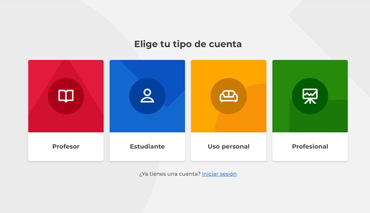 A continuación se abre una nueva pantalla en la que aparecen distintas opciones de tipo de cuenta. Desde la de profesor, para uso profesional, estudiante o personal.
