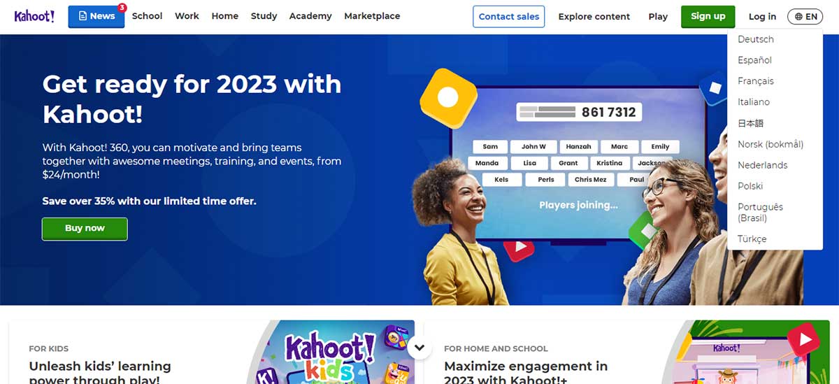 Una de las primeras cuestiones a tener en cuenta es que la página está en inglés, pero es posible traducirla en un solo clic. Una vez accedas a la web de Kahoot, en la parte superior derecha de la página hay un botón con una bola del mundo y dos iniciales. Al pulsar sobre el botón, se despliega un menú con los distintos idiomas en los que es posible usar la web. Hay que buscar la opción ‘Español’ y listo, la página queda automáticamente traducida.