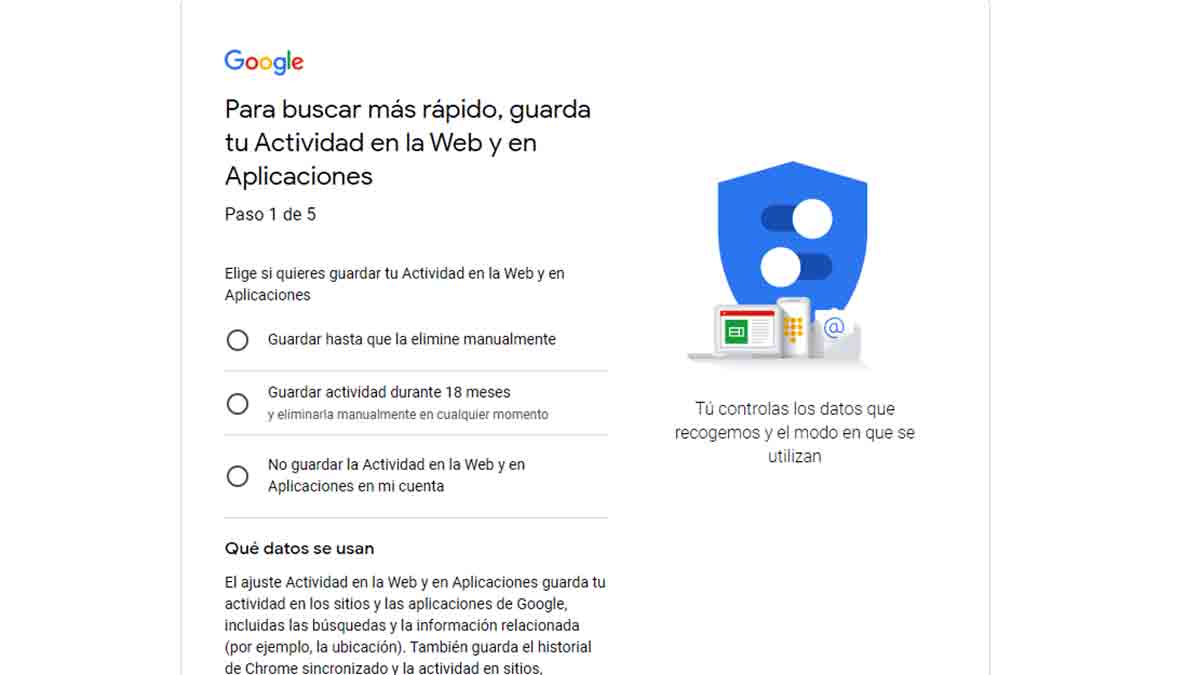 El primer punto a configurar es sobre el almacenamiento de tu actividad. Google pregunta si quieres guardar todo el registro hasta que lo elimines de forma manual, si prefieres guardar sólo lo que hayas realizado en los últimos 18 meses o no guardar ningún tipo de actividad. Debes seleccionar uno y darle a ‘Continuar’.