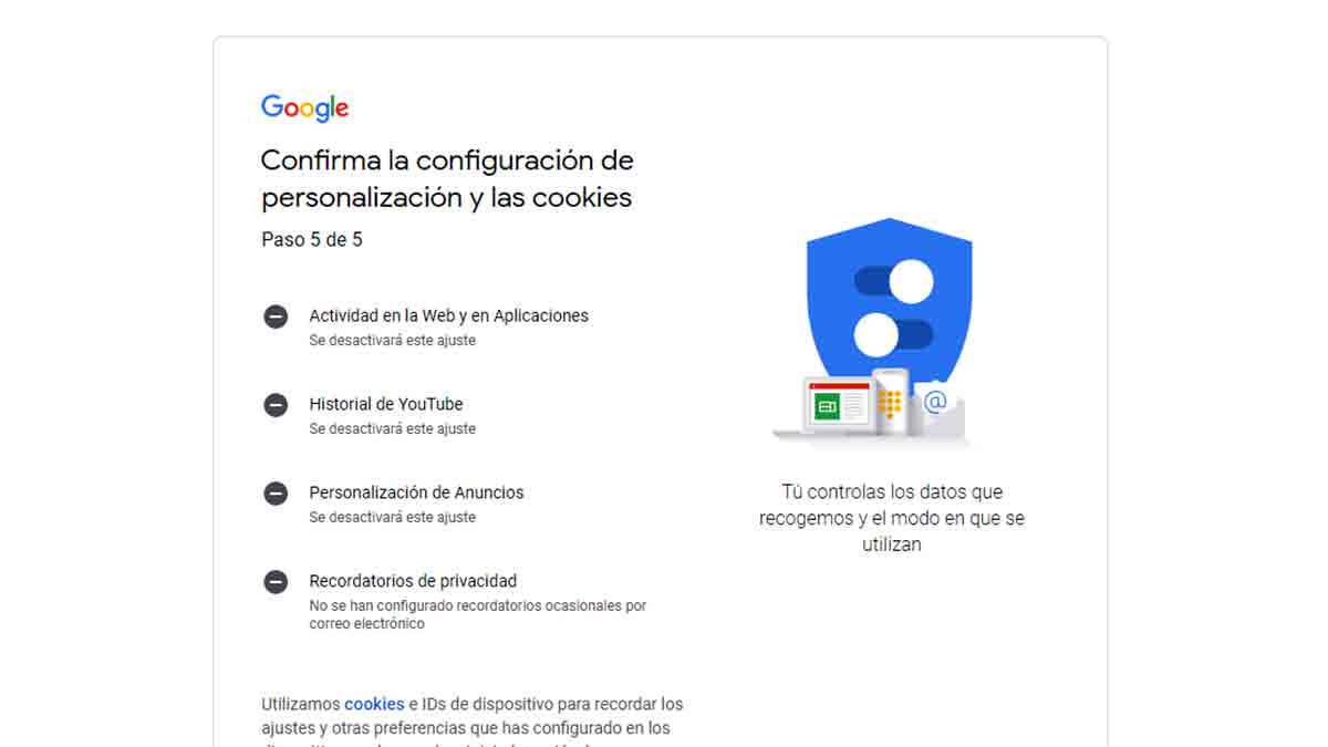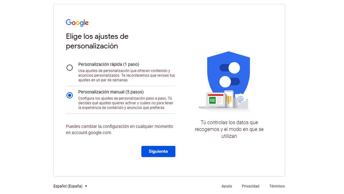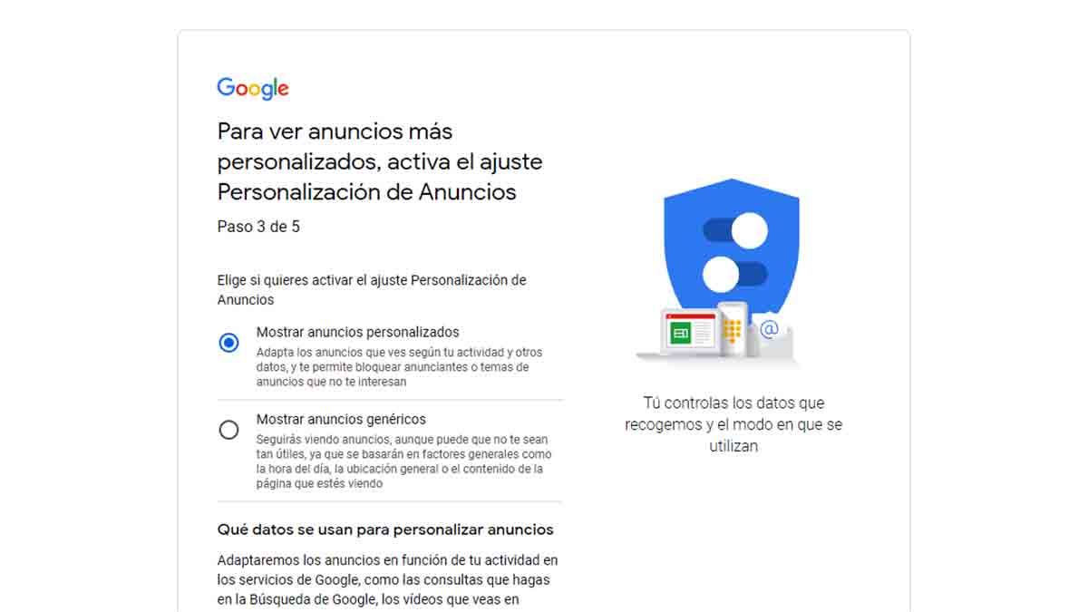 El tercer punto de este tercer paso tiene que ver con los anuncios de Google. En este caso tienes que elegir si quieres que la empresa te muestre anuncios personalizados o genéricos. Los personalizados se toman en función a la actividad que hagas y te permite bloquear anunciantes o temas que no te interesen. Y los anuncios genéricos toman como referencia aspectos generales, sin ningún tipo de personalización.