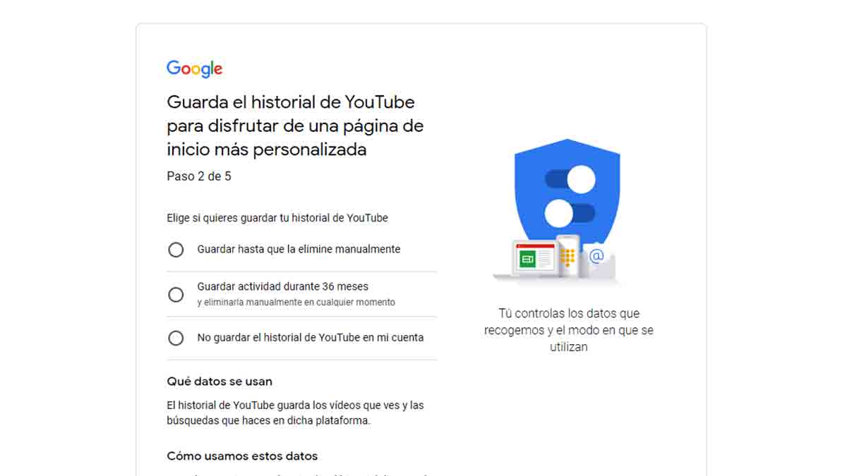 Después, tienes que proceder del mismo modo con el almacenamiento de los datos del historial de YouTube. La pregunta es la misma. Tienes que decidir si quieres guardar el historial de manera permanente, el de los últimos 18 meses o que no quede registro.