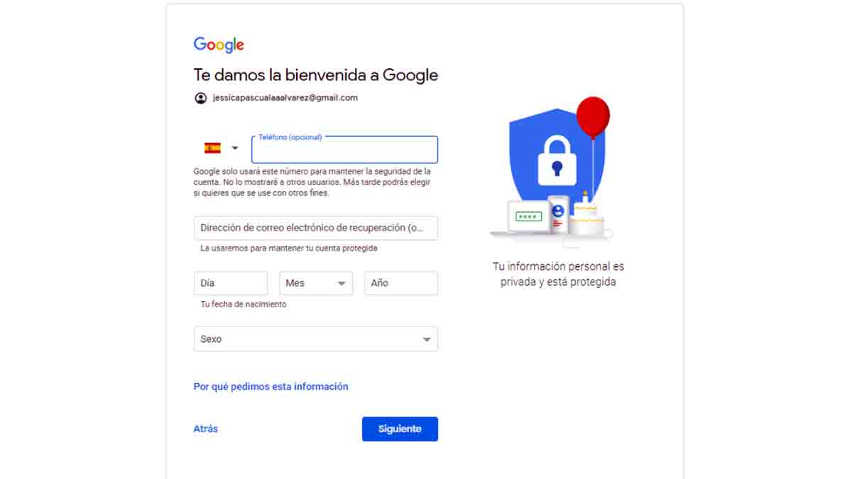 Y lo mismo sucede con la posibilidad de añadir una dirección de correo de recuperación. Es otra medida para recuperar la cuenta en caso de olvidar la contraseña y es totalmente opcional. Puedes introducir la cuenta de tus padres, hijos o pareja.