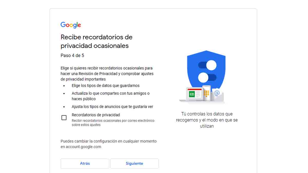 Google te permite configurar los recordatorios de privacidad. La empresa te pregunta si quieres recibir recordatorios ocasionales de la compañía para que revises la privacidad de tu cuenta.