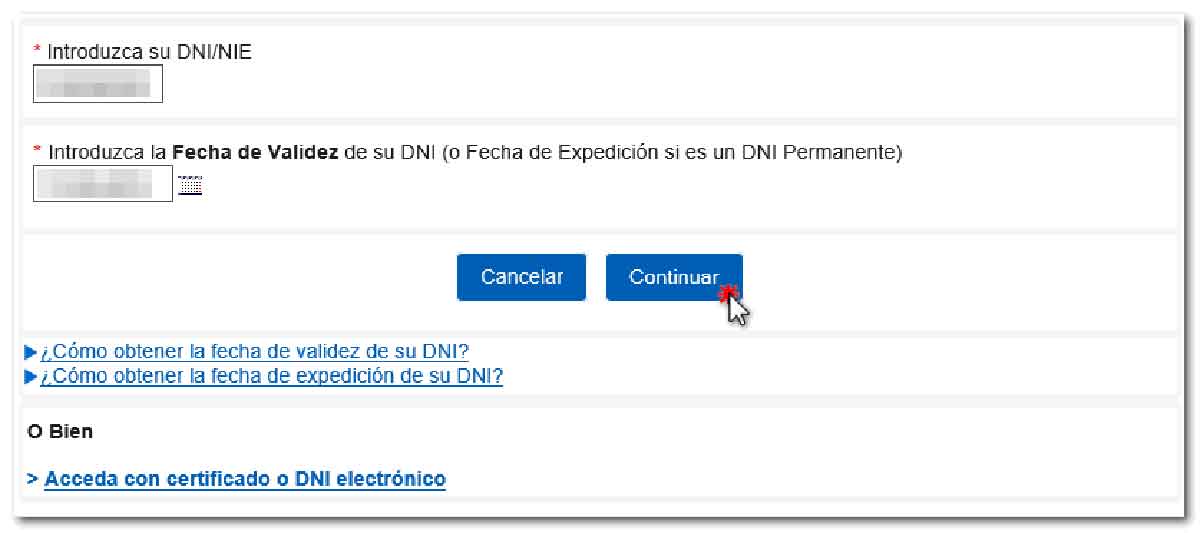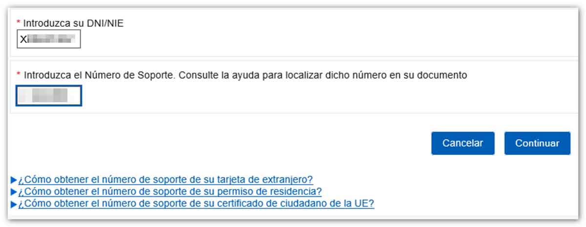 - Si has introducido un NIE, te van a solicitar el número de soporte.