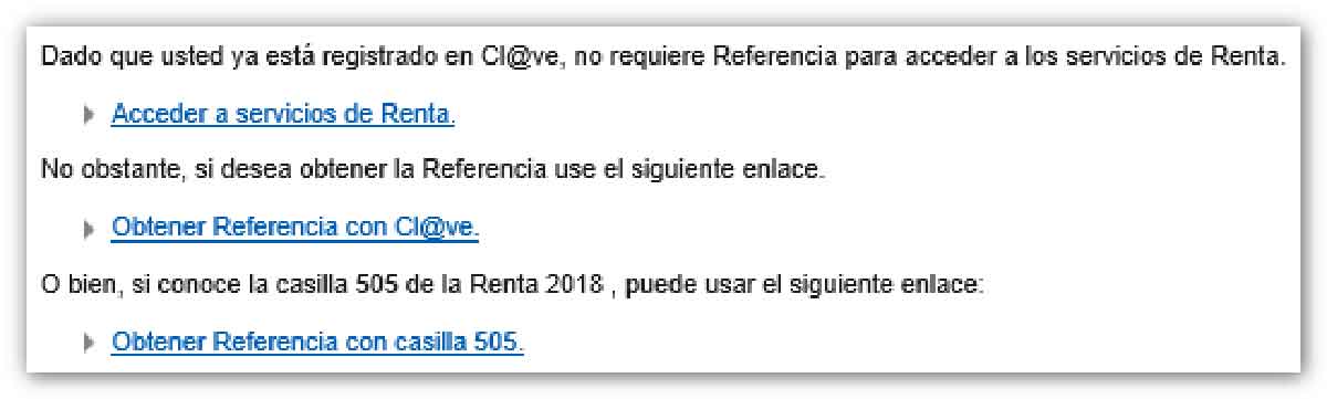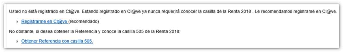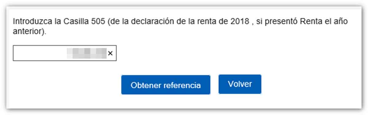 Una vez completas estos datos de identificación, debes iniciar un proceso para la obtención de este número de referencia. Para poder acceder con número de referencia, la web da dos posibilidades. Por un lado, con Cl@ve Pin y, por otro, con el importe de la casilla 505 de la Renta del año anterior, el que coincide con el total de tus ingresos.