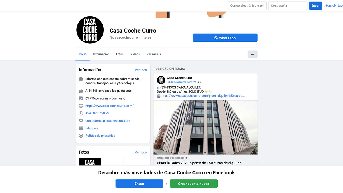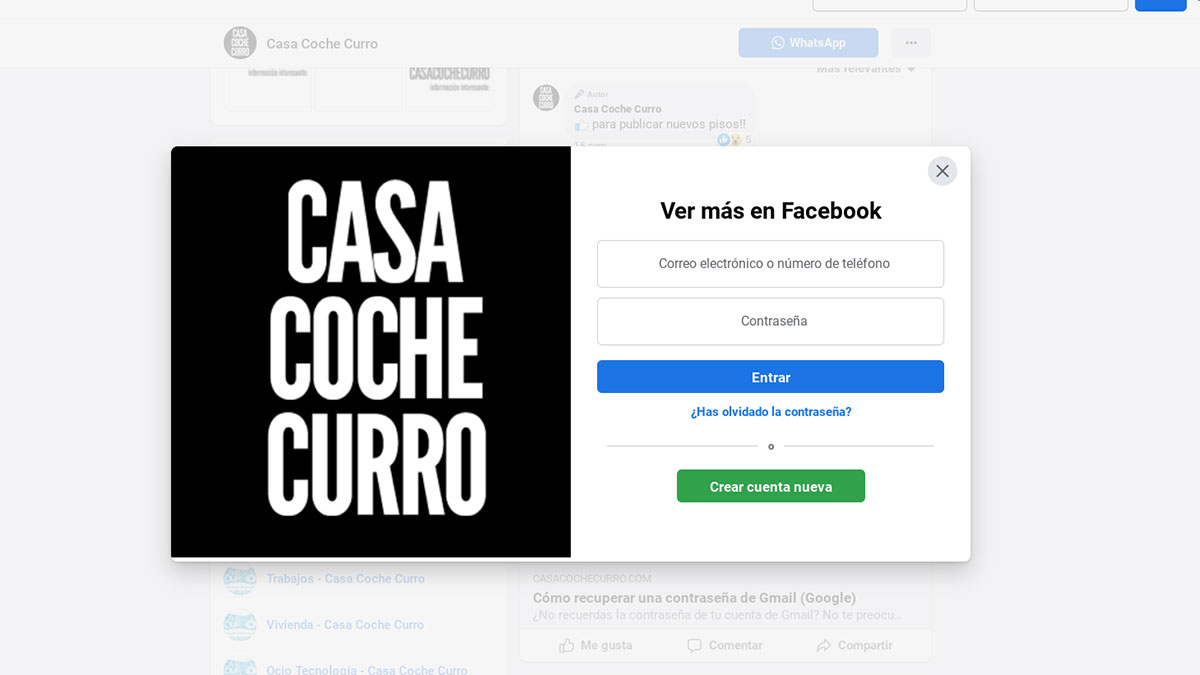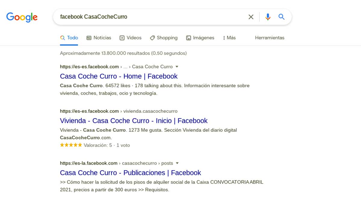 Lo vemos con un ejemplo. Abrimos el navegador de Google y escribimos en la barra de búsqueda ‘Facebook CasaCocheCurro’. A continuación aparecen los siguientes resultados: