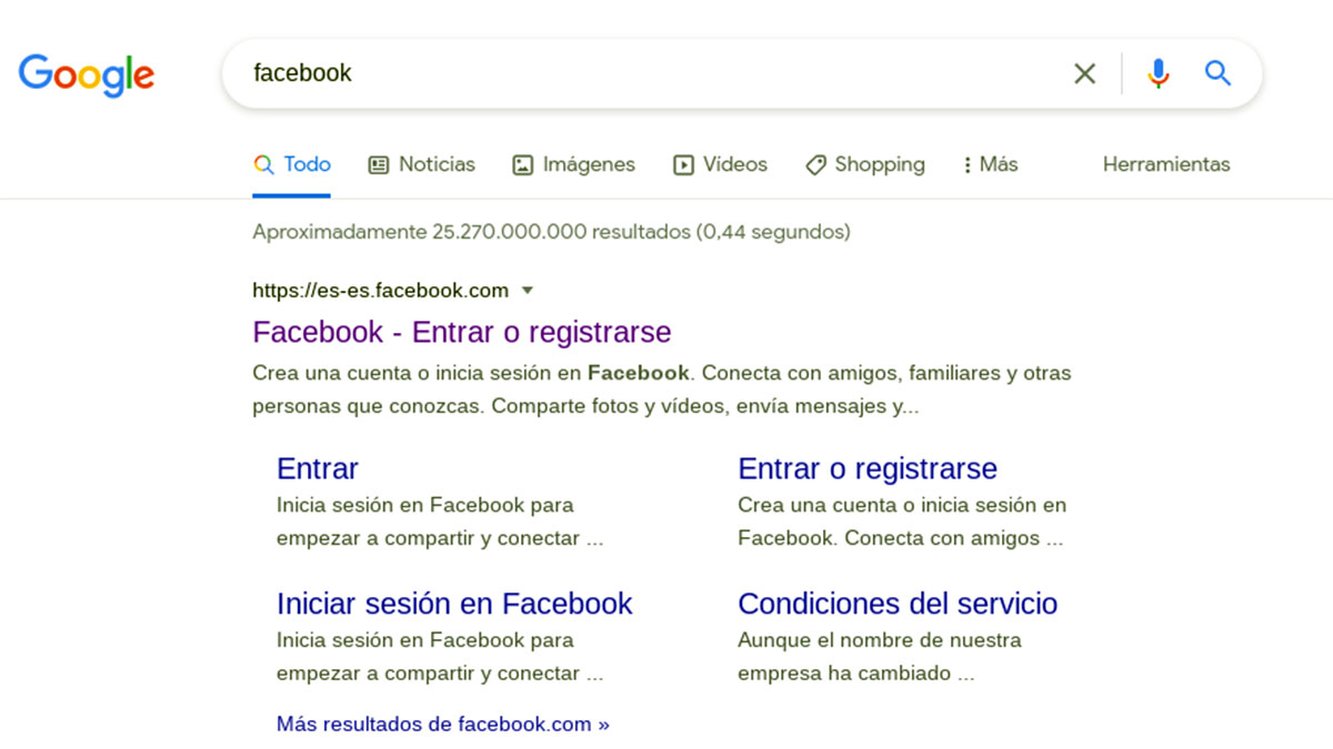 Lo primero que debes saber es que para entrar a Facebook sin registrarte tienes que hacerlo a través del navegador de internet, ya sea en el teléfono, tablet o en el ordenador. No obstante no es posible que una persona sin cuenta entre a esta red social desde su aplicación. Tampoco es posible entrar si buscas la palabra Facebook desde el buscador de internet. Si lo haces, los resultados te llevan a la página de la red social para que inicies sesión, tal y como aparece en la siguiente imagen.