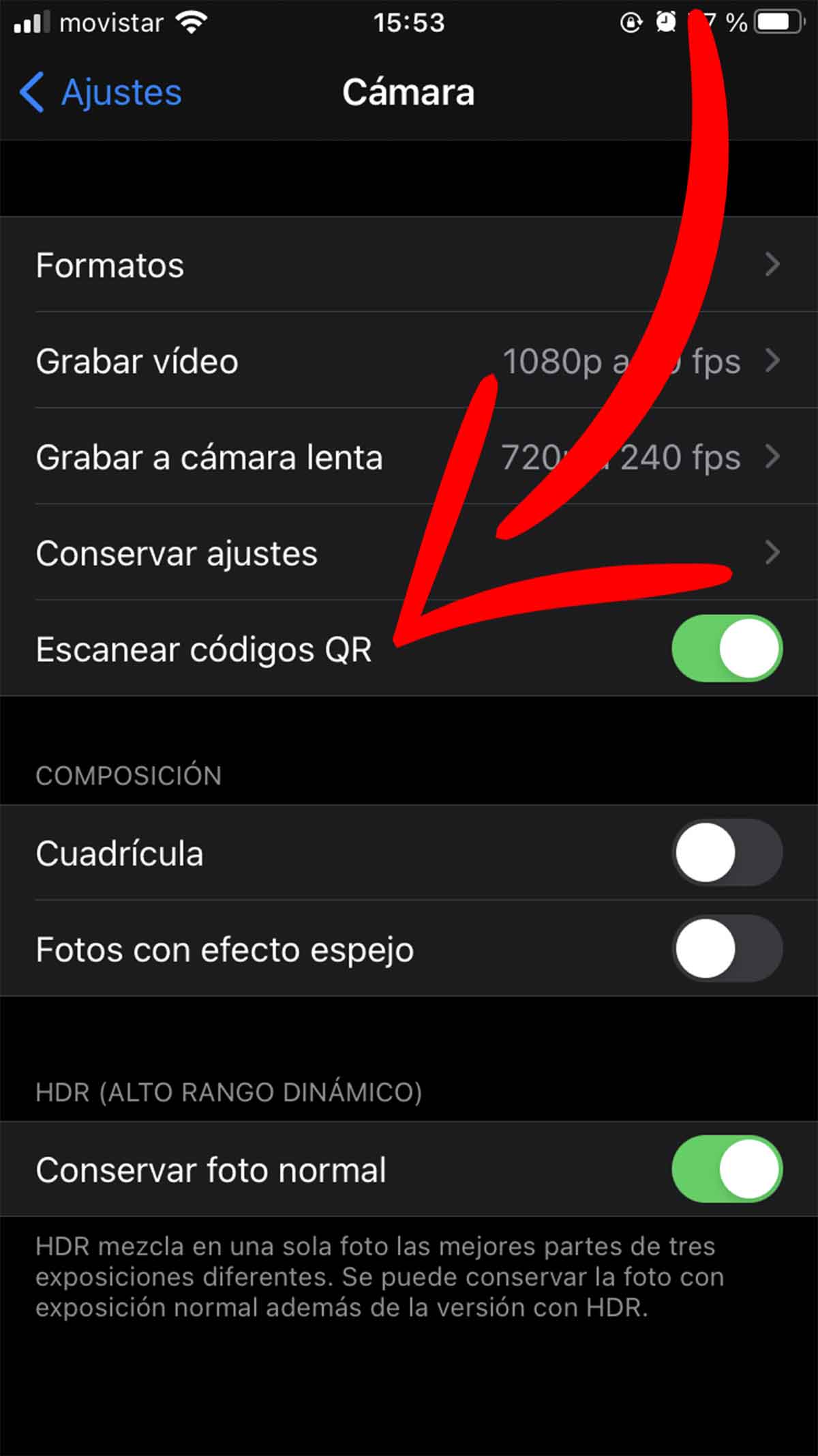 Con las distintas actualizaciones del teléfono se han incluido varias novedades en los iPhone y una de ellas es una aplicación de serie para leer códigos QR. Para localizarla, tienes que ir a los ajustes de la cámara y activar la pestaña que dice ‘Escanear códigos QR’ para que te aparezca, tal y como puedes ver en la siguiente imagen: