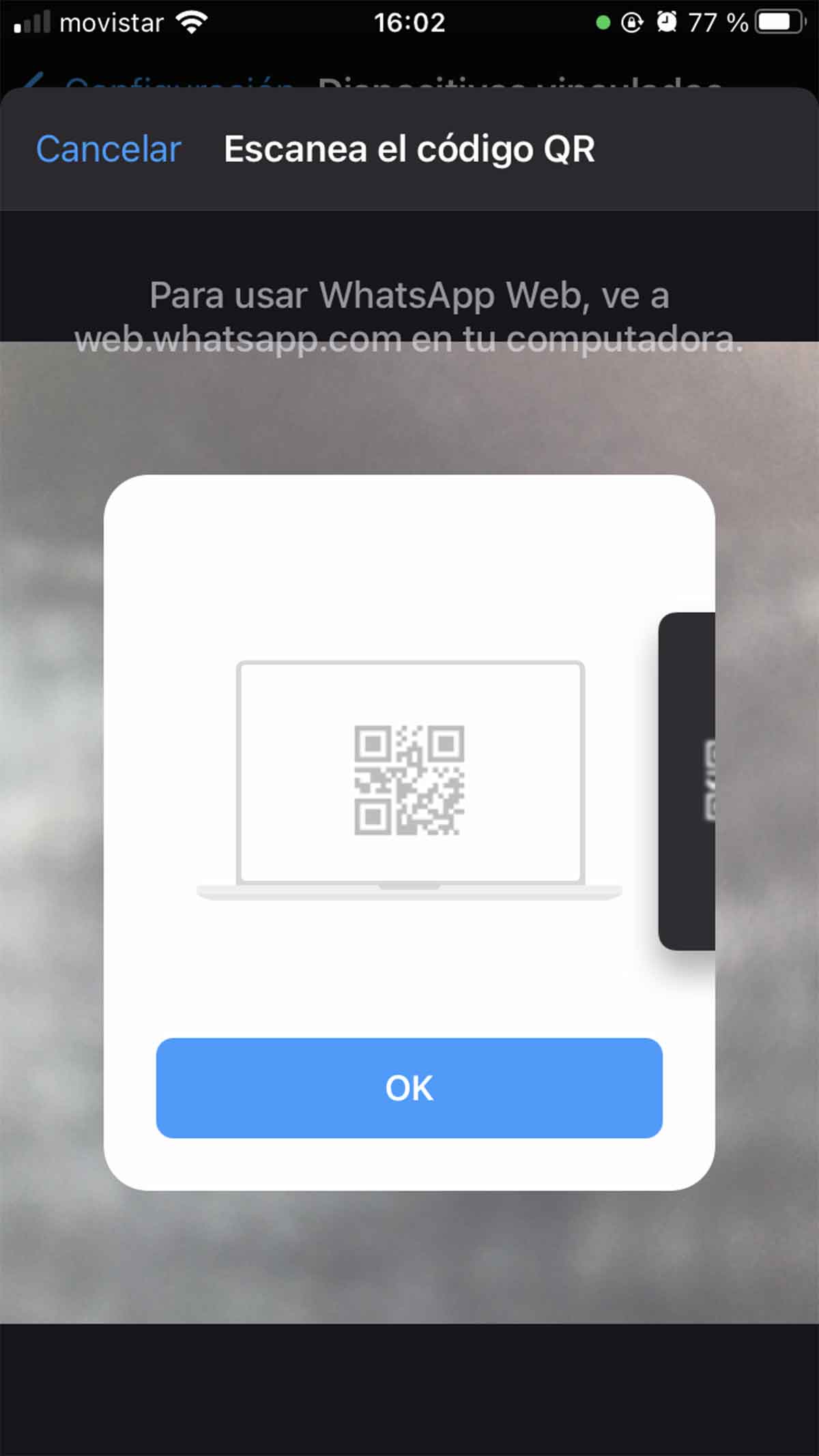 Al hacerlo se abre la cámara y debes enfocar al código QR. Si el teléfono lo detecta, tu pantalla de WhatsApp se traslada al ordenador.