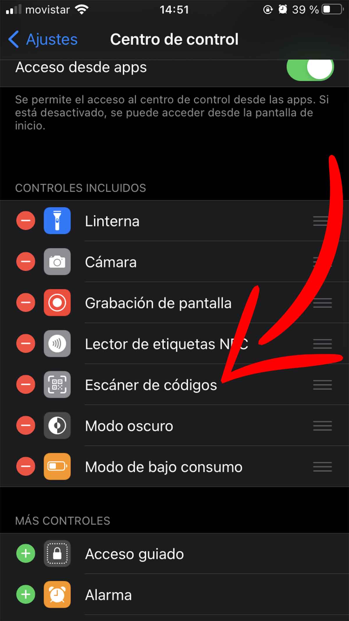 Una vez dentro, tienes que localizar la pestaña ‘Escáner QR’ y pulsar sobre ella para que se coloque entre los accesos directos del menú principal.