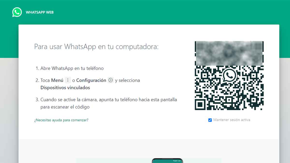 Para acceder a WhatsApp web hay que escanear un código QR que aparece en la pantalla. Lo primero que hay que hacer es acceder a la página oficial de WhatsApp web. Una vez dentro verás una página como la siguiente imagen con un código QR que es único y caduca a los minutos si no se utiliza.