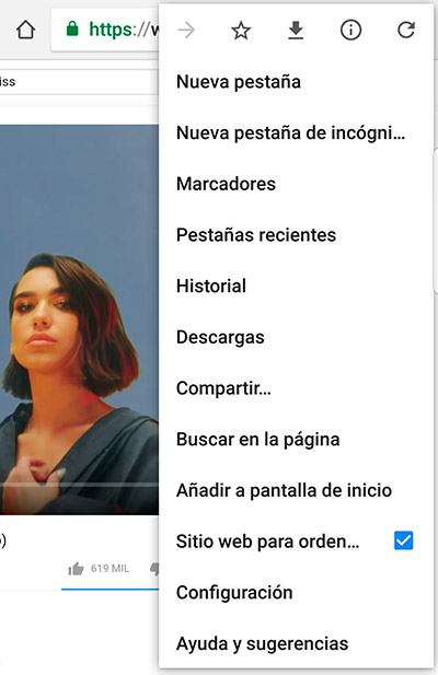 - Una vez dentro de YouTube, hay que ir a las opciones del navegador. A ellas se accede pinchando en los tres puntitos de la esquina superior derecha del navegador.