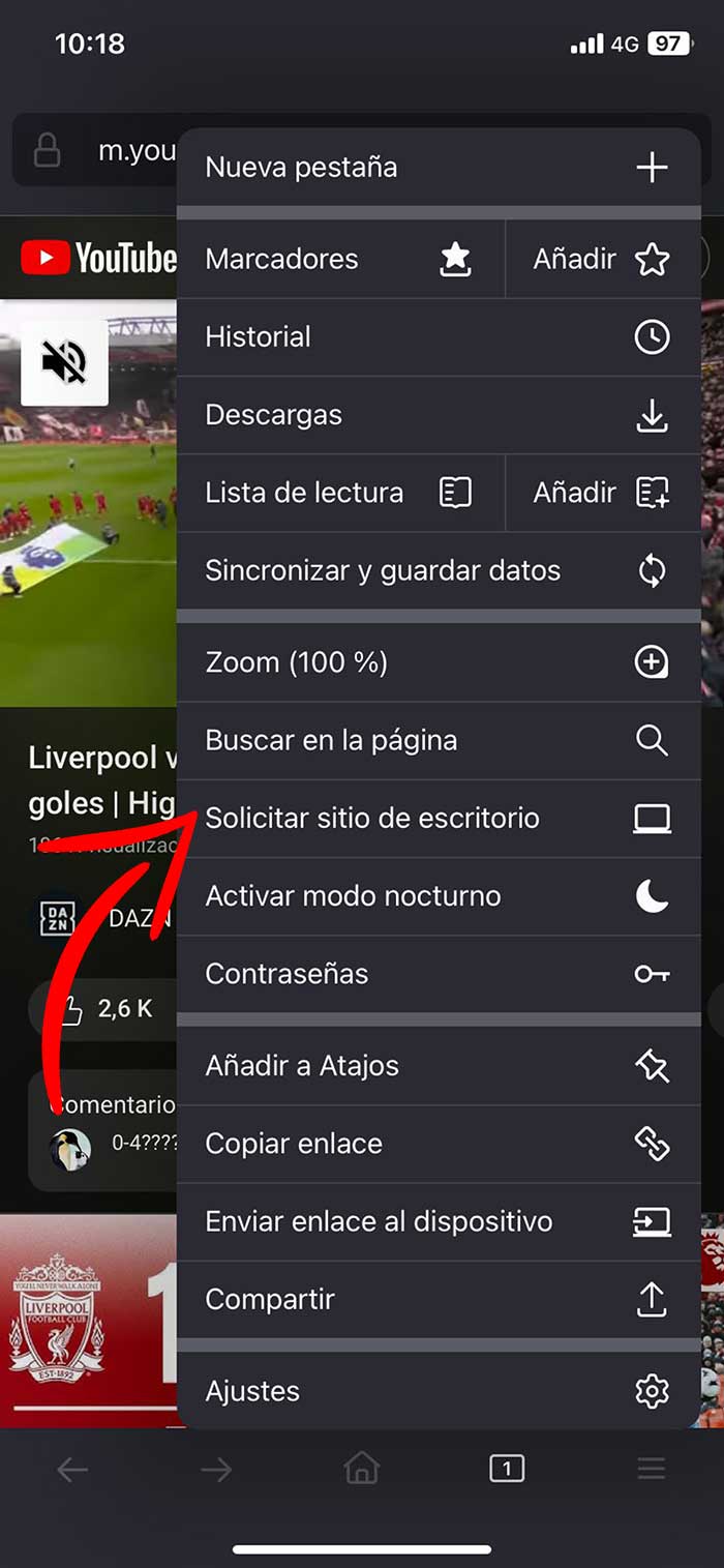 - Selecciona la opción ‘Sitio de escritorio’ o ‘Sitio web para ordenador’, dependiendo de la versión del navegador.