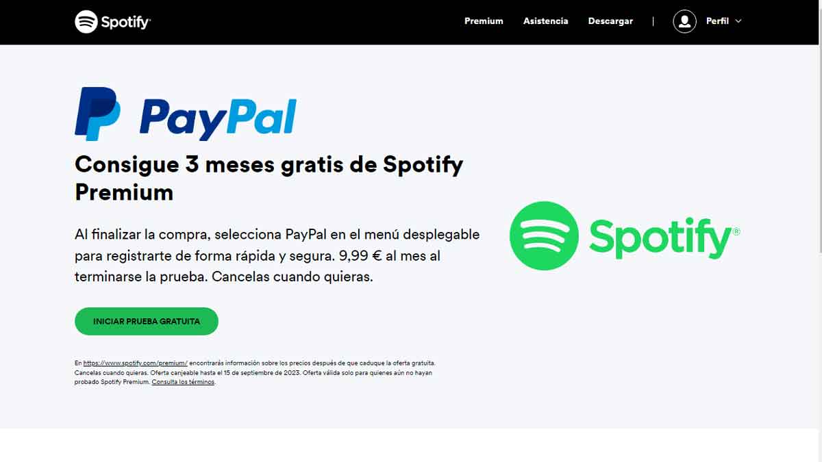 Las ofertas gratuitas que Spotify lanza suelen ser temporales y no todos los usuarios pueden aprovecharse de ellas. En este caso, Spotify te regala una prueba gratuita de 3 meses al pagar tu suscripción mensual con PayPal. Una vez acabado el periodo de prueba, el precio mensual de Spotify Premium será de 9,99 euros al mes.