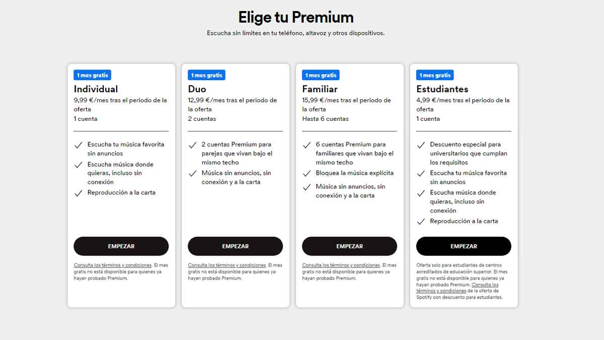 Si no llegas a tiempo para aprovecharte de esta promoción, debes saber que Spotify también ofrece un mes gratuito a través de sus diferentes planes de suscripción.