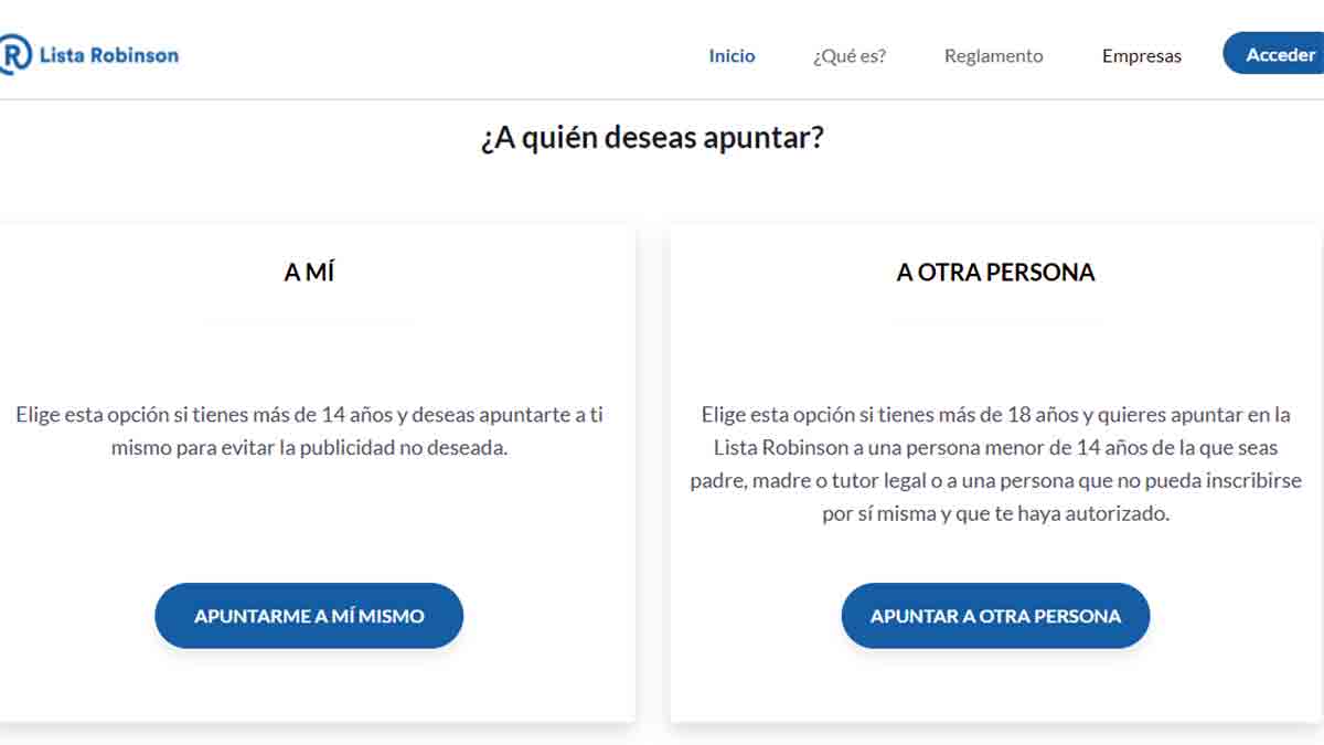 El registro en la lista Robinson es completamente online, por tanto, lo primero que hay que hacer es acceder a la web de la lista Robinson. Al hacerlo, aparece un mensaje que invita a evitar la publicidad no deseada y un botón en el centro de la pantalla que dice ‘Apúntate en la lista‘.