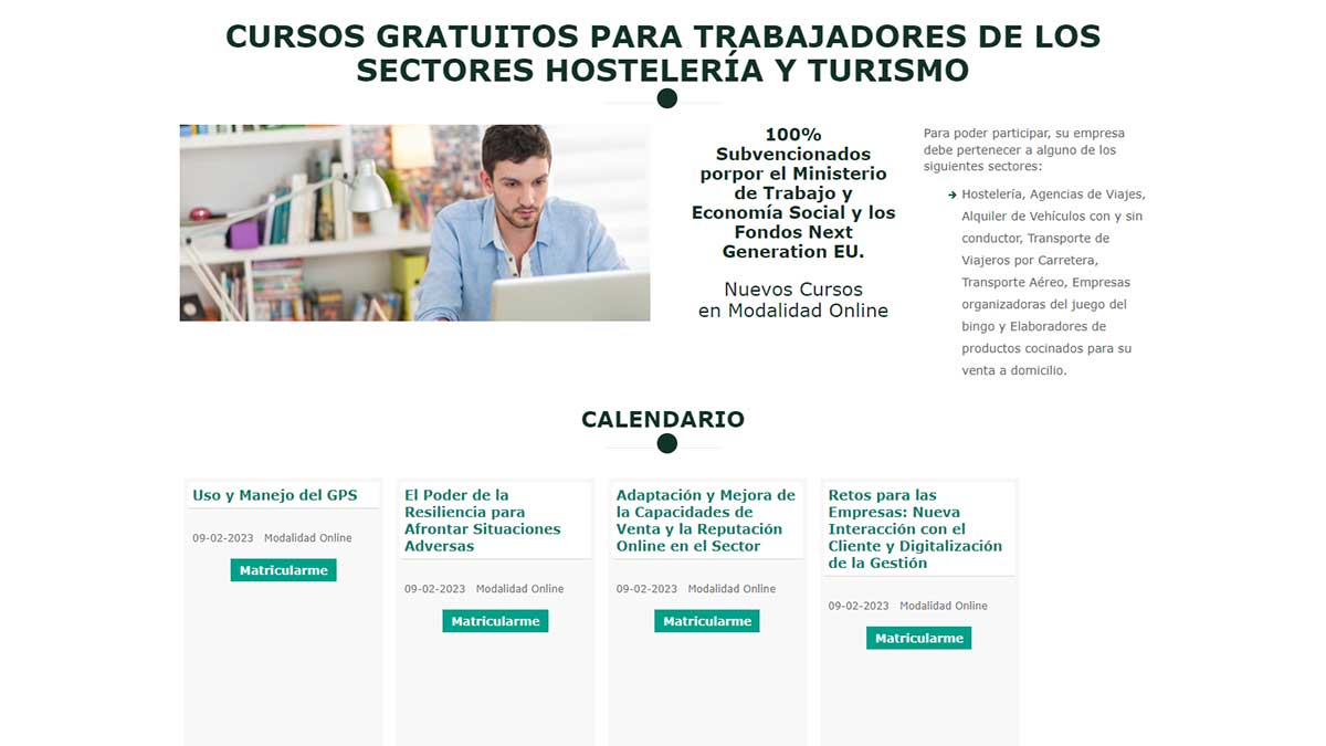 Al seleccionar una de estas opciones, como por ejemplo, Hostelería y Turismo, se abre una nueva pantalla con las formaciones disponibles relacionadas con este sector. Si tras leer los diferentes cursos, alguno te interesa, puedes pulsar en el botón ‘Matricularme’ para consultar todos los detalles de la formación y completar el formulario de inscripción.