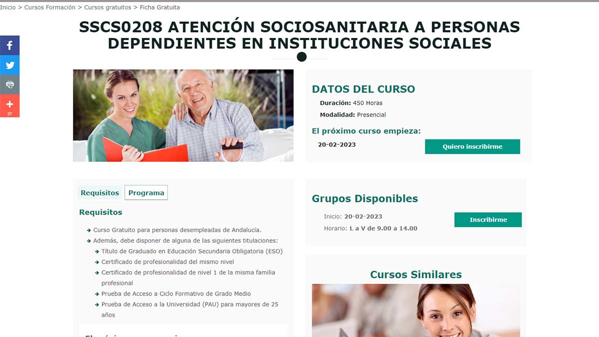 En el interior de las ofertas puedes consultar los requisitos de acceso a la formación, el programa de contenidos, el horario y la modalidad en la que se imparte el curso, así como la duración total de horas. Y la fecha de inicio del curso.