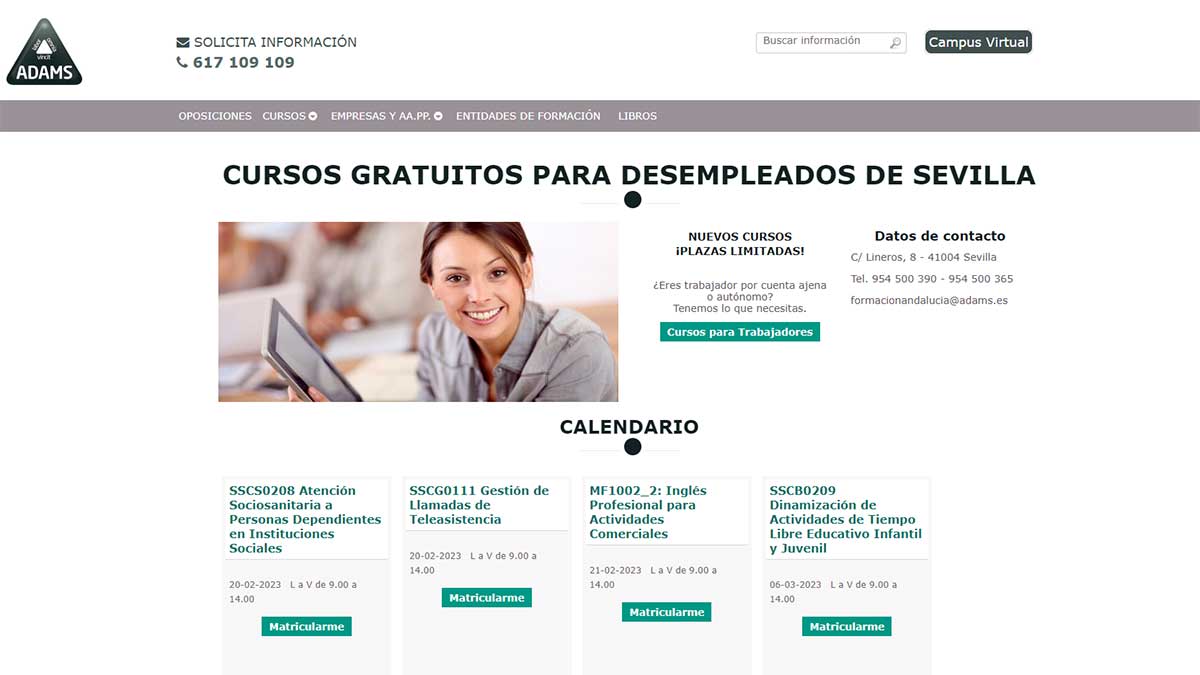 Para inscribirse en un curso gratuito de la academia Adams, hay que acceder a la página oficial del catálogo de cursos. Dentro de la sección específica de la academia hay dos opciones donde elegir, desde los cursos para desempleados hasta aquellos para trabajadores. La temática de los cursos es bastante amplia y, además, en esta compañía se imparten algunos de los cursos de formación digital para autónomos y pymes del programa Digitalízate Plus de la FUNDAE y el SEPE.
