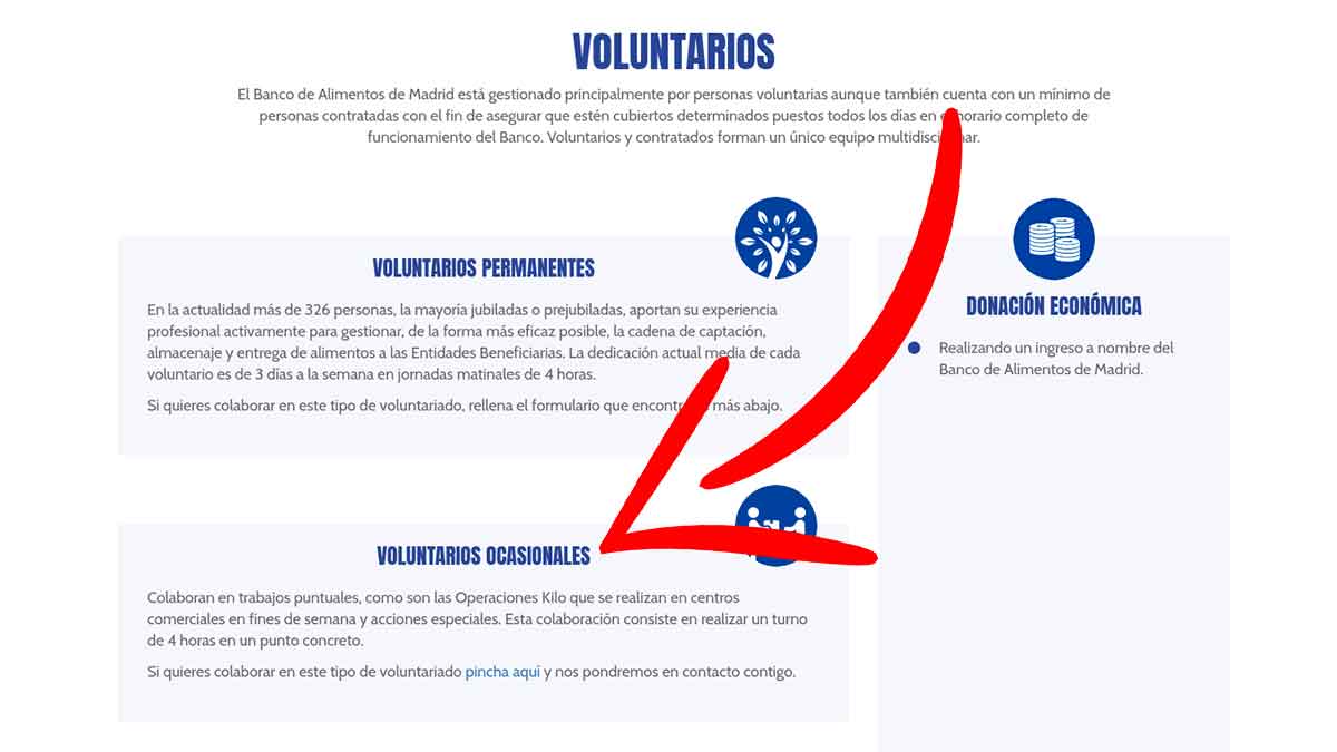 Tras pulsar el botón, tiene que aparecerte una nueva página como la que ves en la imagen. Aquí tendrás que seleccionar qué tipo de voluntario quieres ser, si permanente, para ayudar de forma fija unos días a la semana o voluntario ocasional, para hacerlo en campañas específicas. En el caso de Madrid, los voluntarios ocasionales deben realizar turnos de 4 horas en un punto concreto.