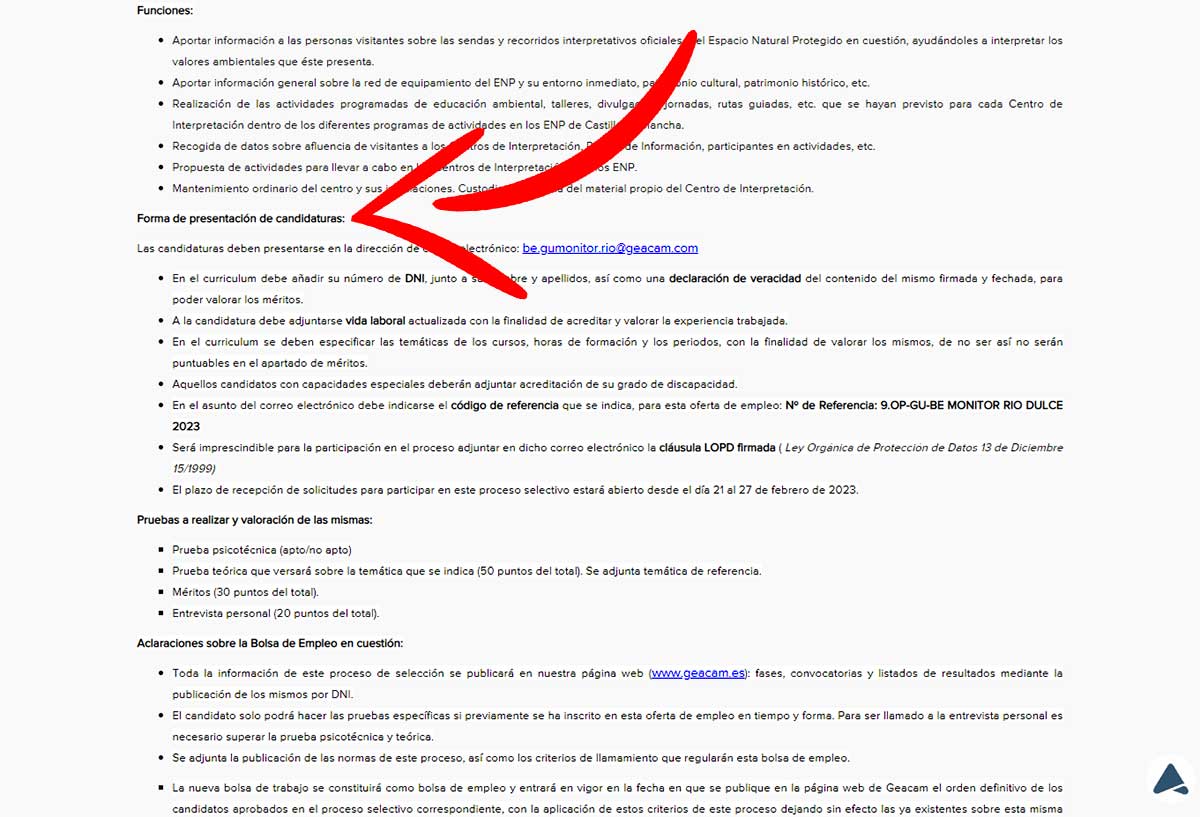 Por el contrario, en el interior de cada una de las ofertas se detallan los pasos a seguir que tienen que dar los aspirantes para formalizar su candidatura. Por ejemplo, en una de las ofertas se detalla que las personas interesadas deben enviar su candidatura mediante un correo electrónico junto con el DNI, una declaración de veracidad, la vida laboral y otros documentos específicos.