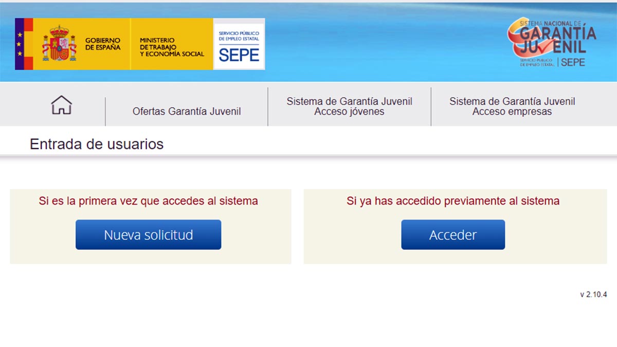 Para optar a alguno de los cursos, becas o contratos de prácticas de este nuevo buscador del SEPE, primero hay que inscribirse en el sistema de Garantía Juvenil. Para ello, hay que acceder al portal específico de Garantía Juvenil. En esta página, tal y como puedes ver en la imagen, aparecen dos botones. Si es la primera vez que accedes al sistema, tienes que pulsar sobre el botón de la derecha que dice ‘Nueva solicitud‘.