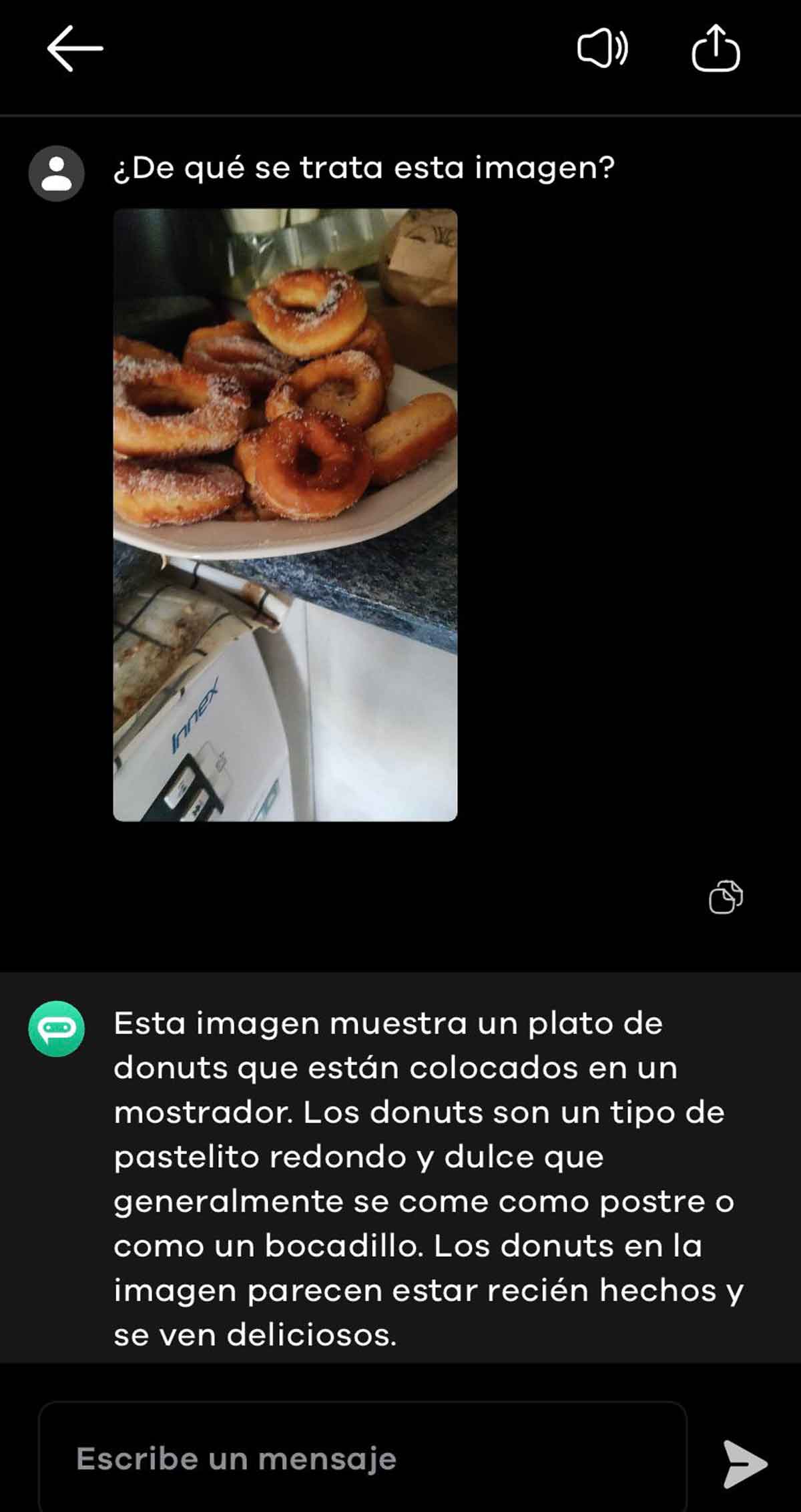 Aunque, sin duda, una de sus características más destacadas es poder añadir imágenes de la galería de tu móvil o captar una nueva con la cámara y hacerle preguntas cómo: ¿De qué se trata esta imagen? ¿Qué es este lugar? ¿Quién es esta persona? ¿Qué tipo de planta es esta?