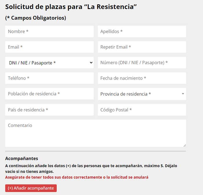 - Rellena todos los campos obligatorios con tus datos personales. También podrás escoger hasta un máximo de 5 acompañantes en este paso.