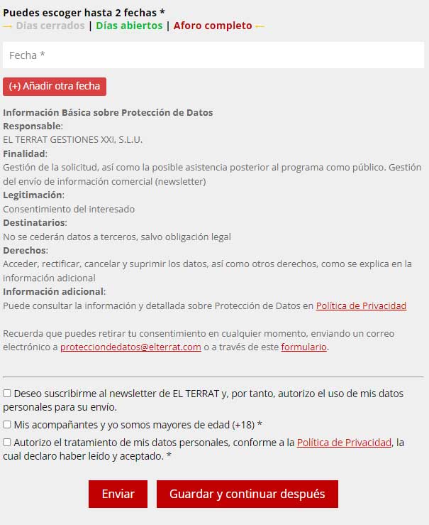 - Por último, acepta la política de privacidad y pulsa en ‘Enviar’ para reservar los asientos.