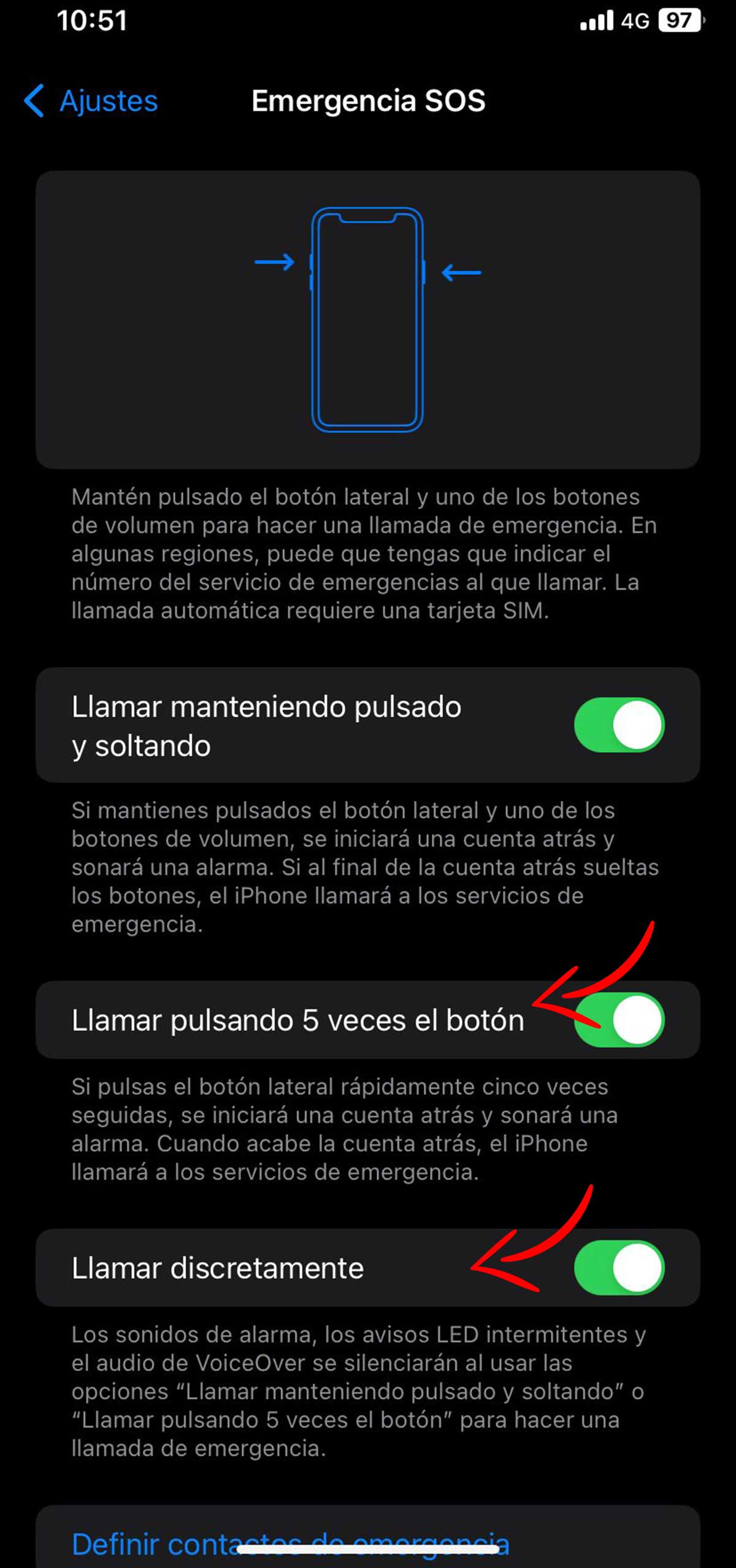 - Si además quieres que la llamada de emergencia se haga de forma silenciosa, activa la función ‘Llamar discretamente‘ que aparece justo debajo.