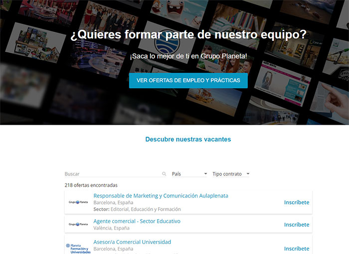 Una vez llegues al apartado de trabajar en La Casa del Libro, aparecerá un mensaje en el que te indica dónde debes enviar el CV. Si pinchas en el enlace, irás al portal de empleo del Grupo Planeta, empresa a la que pertenece La Casa del Libro. Allí puedes consultar todas las ofertas de empleo disponibles en el Grupo Planeta.