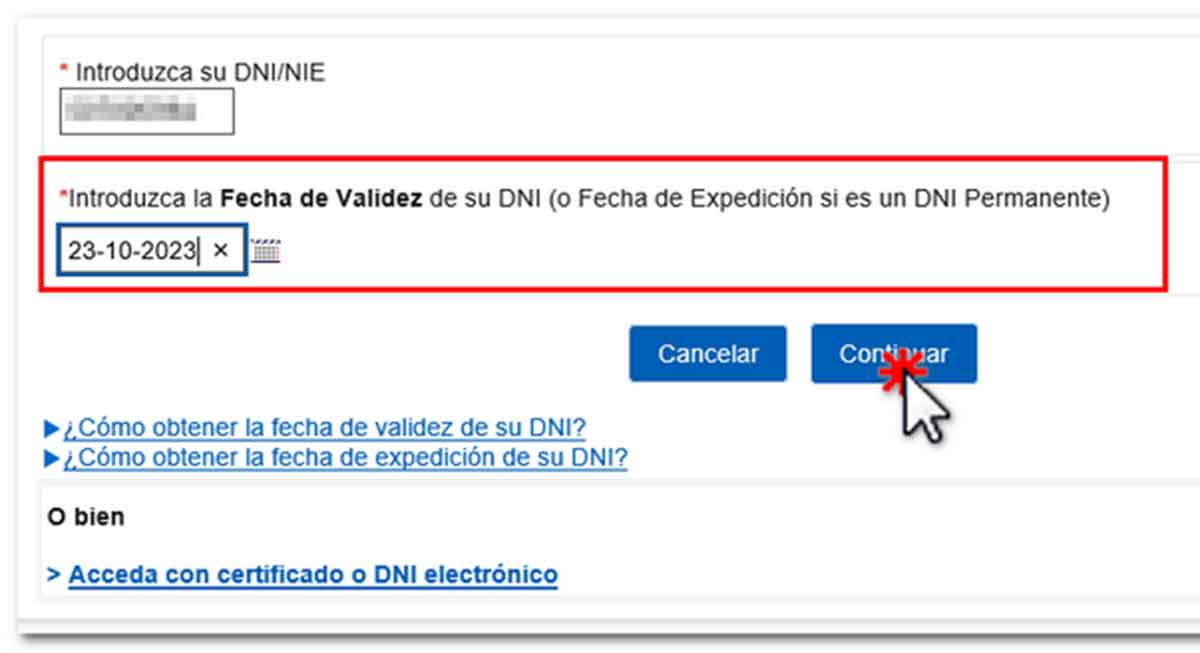 Una vez introducidos los datos, aparece en la pantalla un nuevo campo en el que el contribuyente debe indicar la fecha de validez del DNI bajo el formado día – mes – año. Es importante introducir la fecha con guiones separados porque, en el caso de no hacerlo, no será posible continuar con el proceso. En el caso de que el declarante tenga un DNI permanente, la fecha que se solicita es la de expedición del documento.
