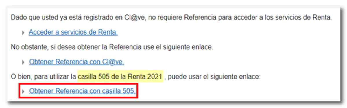 En el caso de que el solicitante no esté registrado en Cl@ve, puede acceder a la referencia con el dato de la casilla 505 de la renta del ejercicio anterior. Para ello, hay que pulsar el botón ‘Obtener referencia con casilla 505’, tal y como aparece en la siguiente imagen.