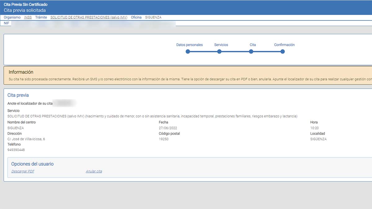 Si pulsas el botón ‘Aceptar’, la cita queda confirmada. En la pantalla aparece un aviso que te indica que la cita ha sido procesada correctamente y que va a llegarte un mensaje de texto al teléfono que has introducido en el proceso con la confirmación.
