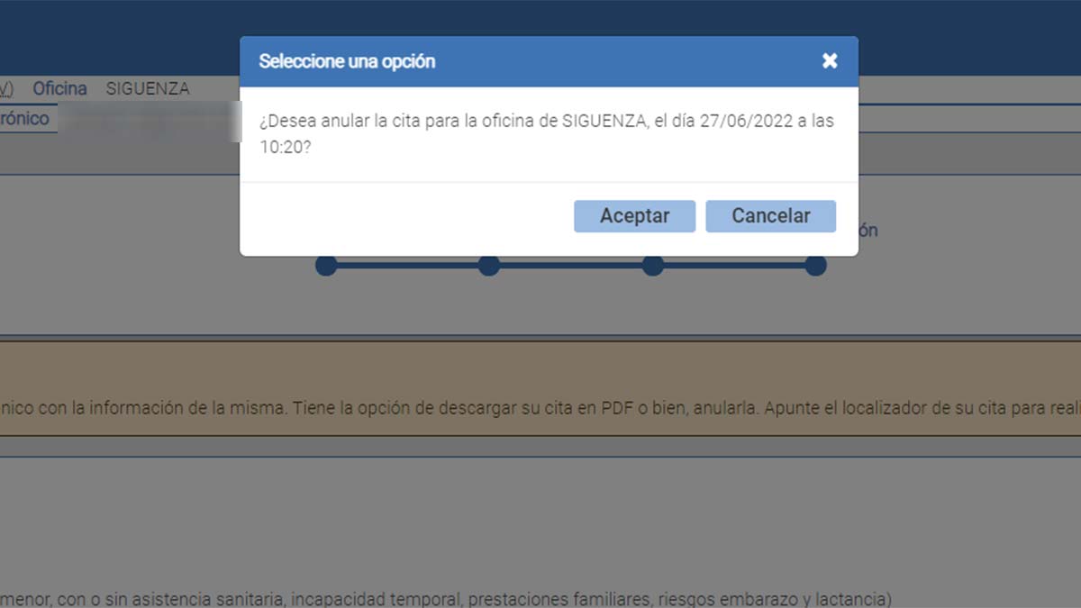 Si te has equivocado al pedir la cita y quieres cancelarla, en la parte inferior de la pantalla hay un enlace que dice ‘Anular cita‘. El trámite para cancelar esta cita es aún más sencillo. Solamente tienes que pulsar este enlace. Se abre una ventana emergente que te pregunta si quieres cancelar la cita y, si pulsas en el botón ‘Aceptar’, automáticamente queda anulada.