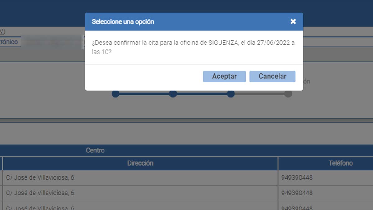 Después, tienes que elegir una de las citas de entre todas las que se muestren en pantalla. Al pulsar sobre ella, aparece una ventana emergente en la que te preguntan si quieres confirmar esa cita. En esta nueva ventana aparece de manera detallada y resumida los detalles de la cita. Desde la oficina hasta el día y la hora.