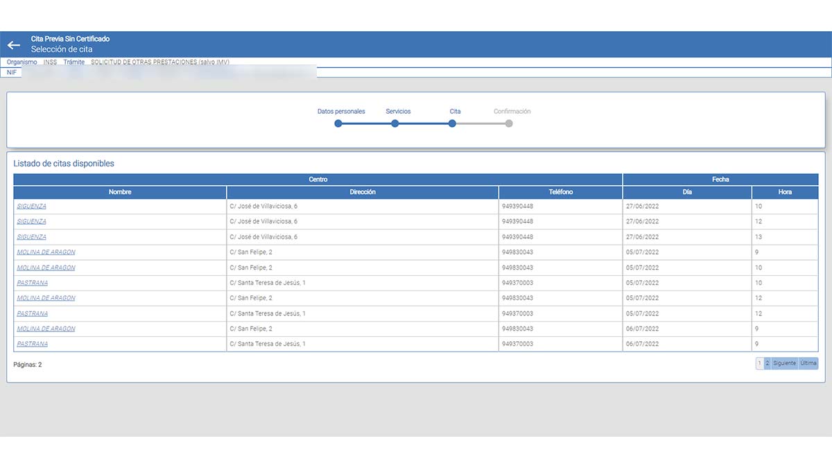 En la siguiente pantalla aparece un listado de todas las oficinas que coinciden con tus criterios de búsqueda, tienen disponible una cita para atenderte.