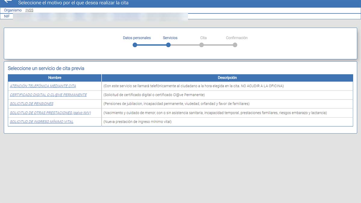 Una vez tengas todo completo, pulsa el botón que aparece a final de la pantalla que dice ‘Continuar’. Después se abre una nueva página en la que aparece un listado en el que tienes que seleccionar el tipo de servicio que quieres gestionar: