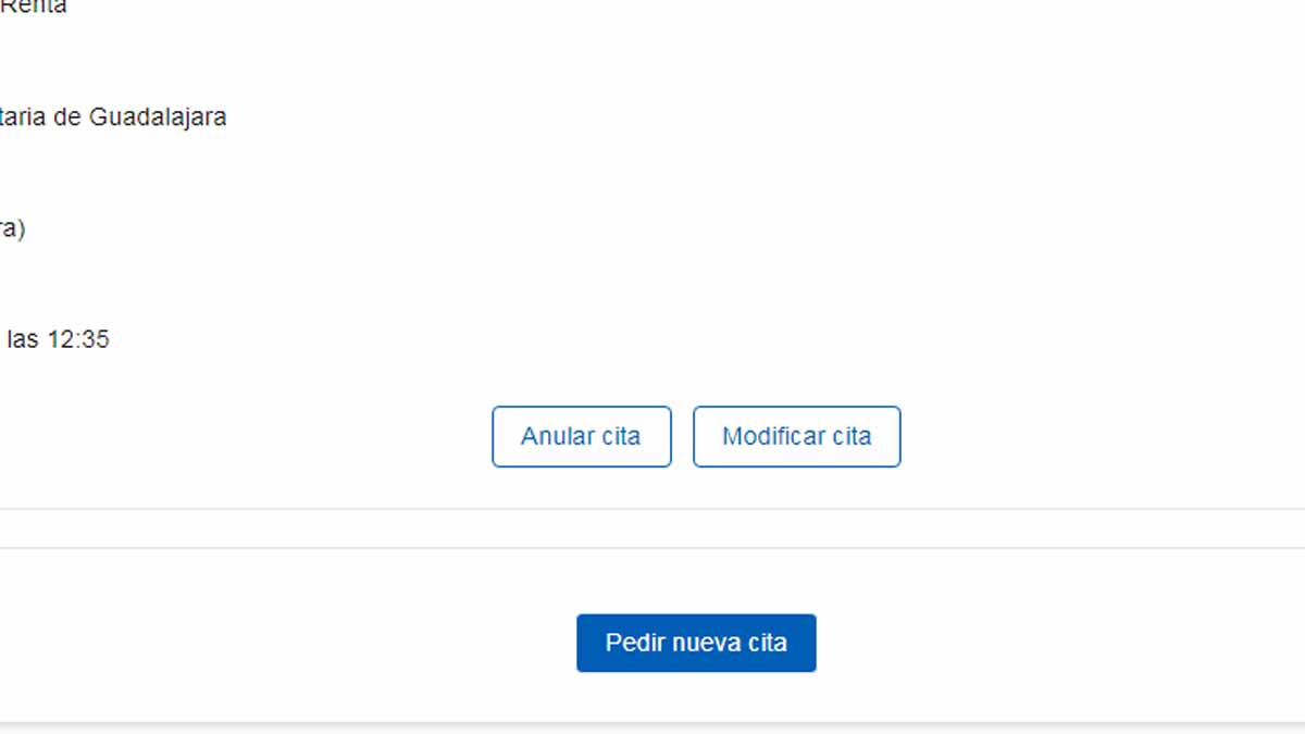 Al final de esta misma pantalla, hay dos botones, uno para anular la cita y otro para modificarla. Si adicionalmente, quieres solicitar otra cita, puedes hacerlo a través de otro botón que dice ‘Pedir una cita previa’.