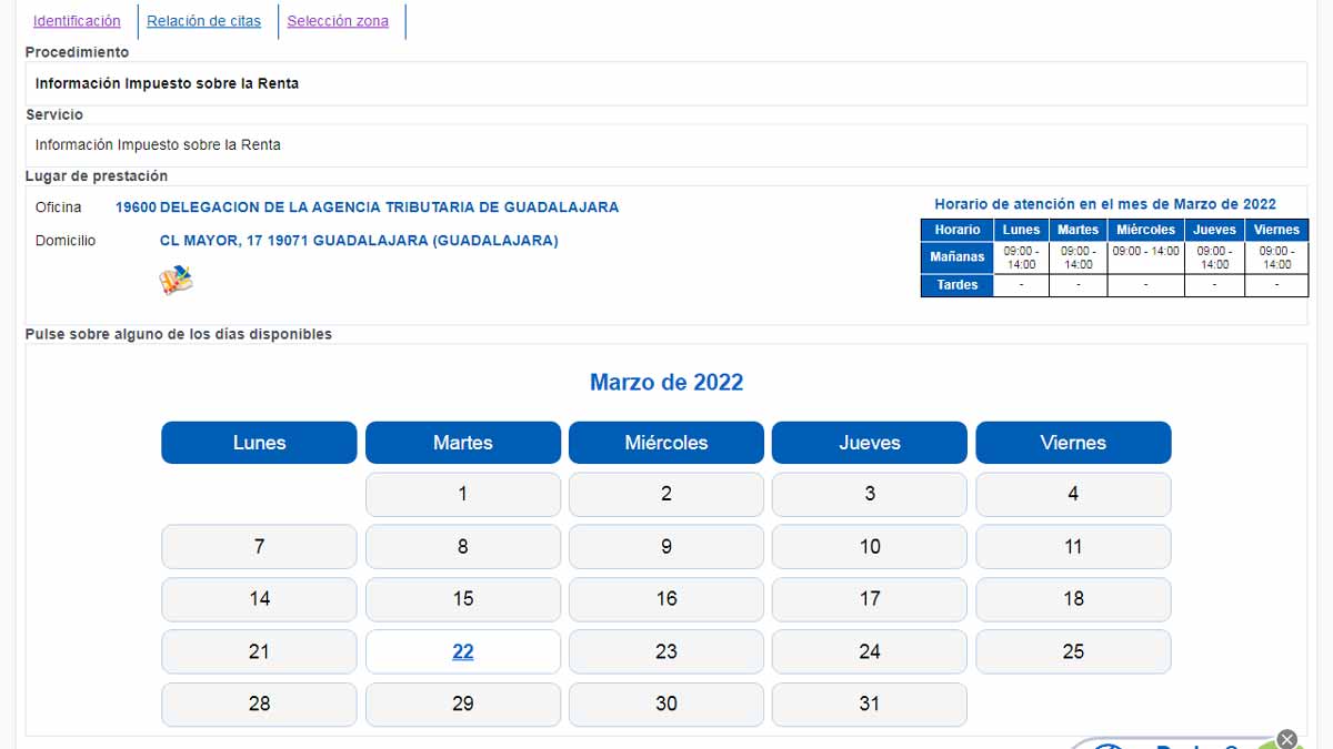 Por último, aparece en la pantalla la oficina que corresponde según lo que has marcado y el horario de atención al público que ofrece.