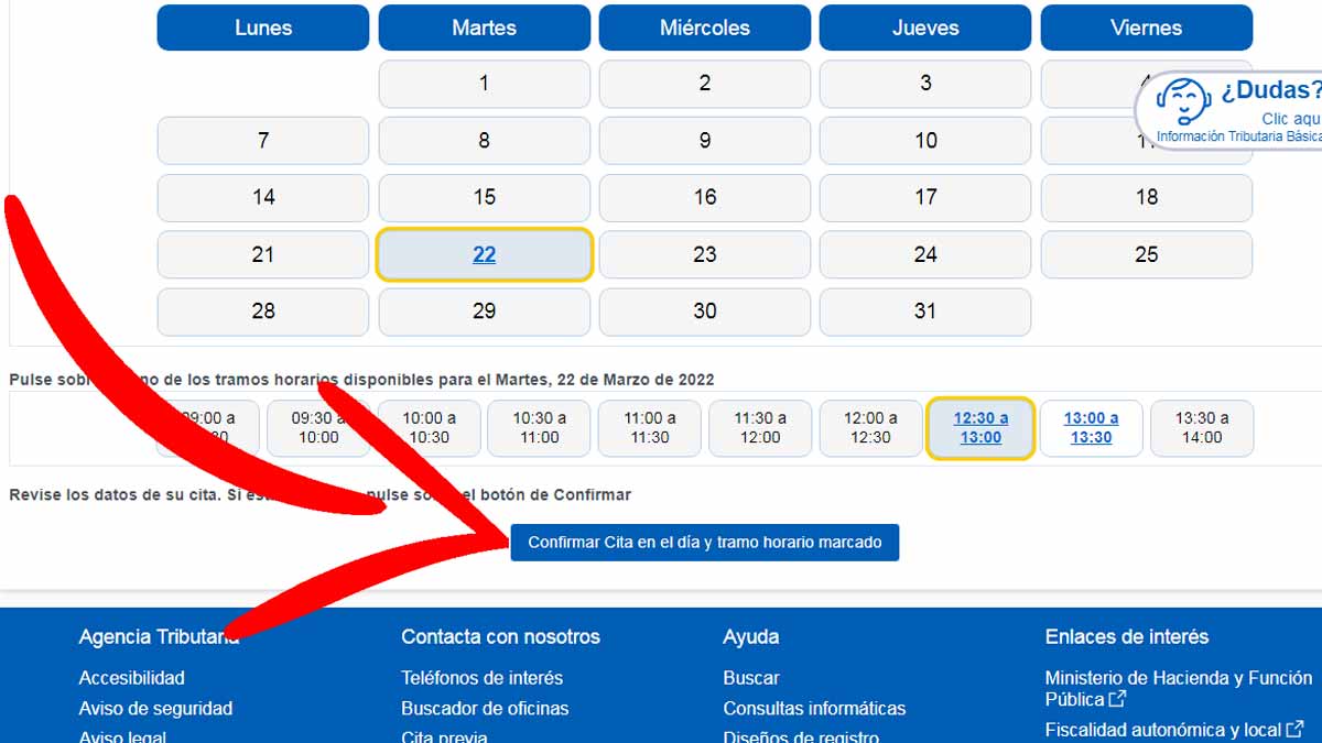 Si quieres confirmar la cita, tienes que pulsar el botón que aparece al final de la página que dice ‘Confirmar cita en el día y tramo horario marcado’. A continuación puedes ver la información y confirmación de tu cita.