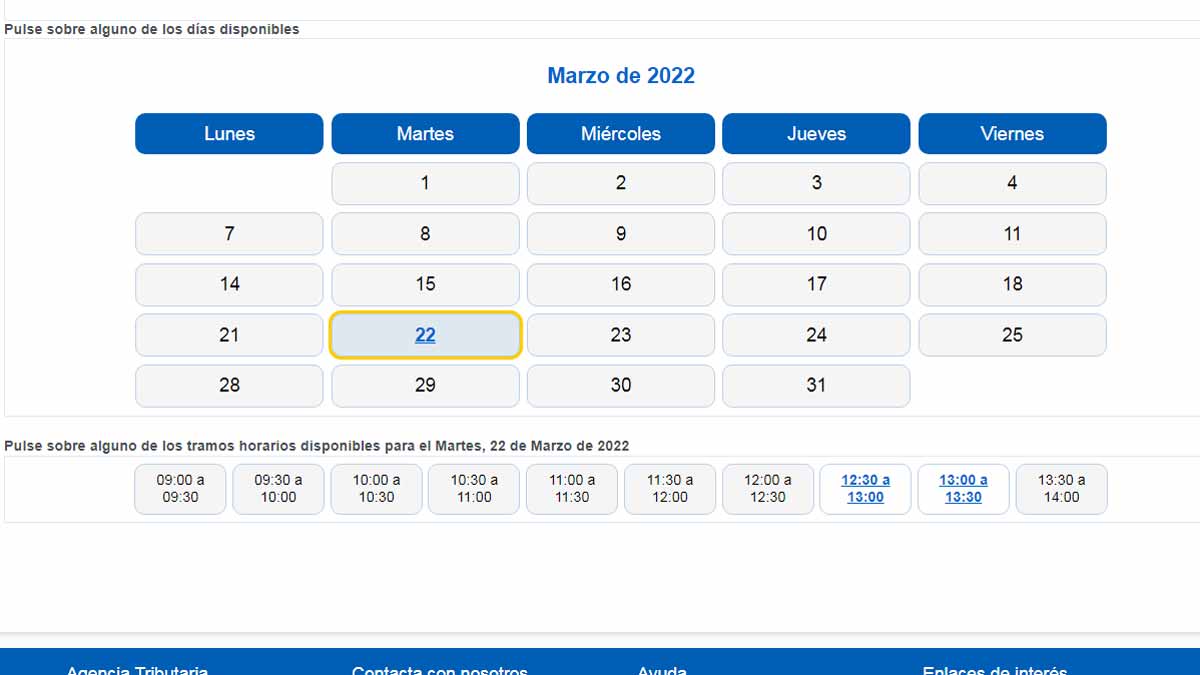 Para fijar una fecha concreta, tienes que pulsar sobre alguno de los días libres del calendario. Al hacerlo, aparecen las franjas horarias que están libres y en las que puedes solicitar una cita.