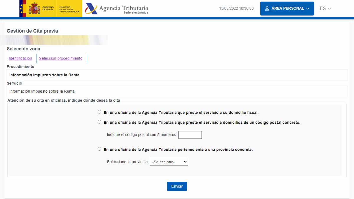 En el siguiente paso hay que indicar en qué oficina quieres pedir la cita. Si prefieres que sea en la que presta servicio al domicilio fiscal. En la oficina que preste servicio a los domicilios de un código postal concreto o a la oficina de la Agencia Tributaria perteneciente a una provincia concreta.