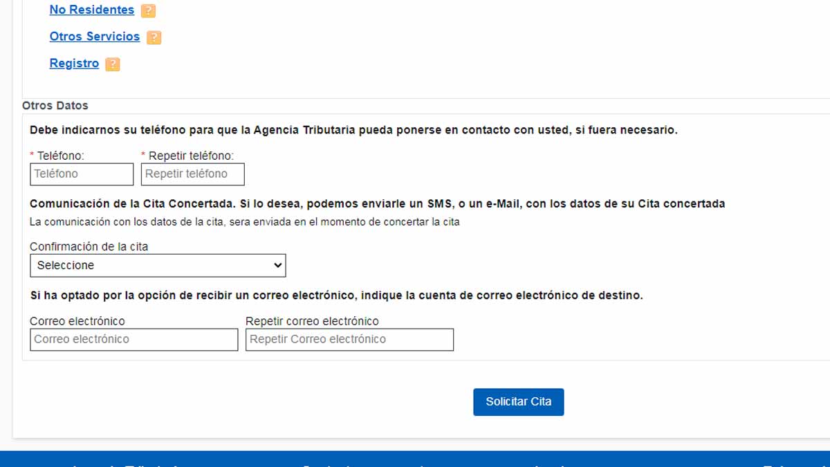 De todo el listado de procedimientos que muestra la pantalla, solamente pueden marcarse un máximo de 3. A continuación, al final de la página tienes que indicar el teléfono de contacto para que Hacienda pueda ponerse en contacto contigo en caso de ser necesario. También puedes indicar que te envíen una notificación recordándote la cita y la vía por la que quieres recibirla. Una vez tengas todos los datos completados, tienes que pulsar el botón que está al final de la página que dice ‘Solicitar cita‘.
