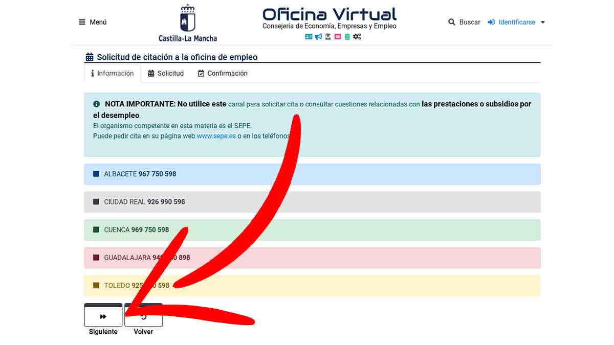 Al acceder a este apartado se abre una nueva pestaña en la que aparece un listado con el teléfono SEPECAM en las distintas provincias de Castilla-La Mancha. Si quieres continuar con el proceso para obtener la cita por Internet, tienes que darle al botón que se encuentra en la parte inferior de la página y que dice ‘Siguiente’.